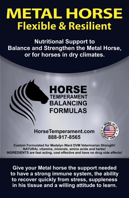 The Metal horse temperament is generally an easy keeper who assimilates nutrients well. The organs associated with the Metal Element are the lung and large intestine so so the 3 top supplements for the Metal horse temperament will give these organ systems support. Metal horses need additional quality fat in the diet, as well as extra electrolytes and pungent herbs.